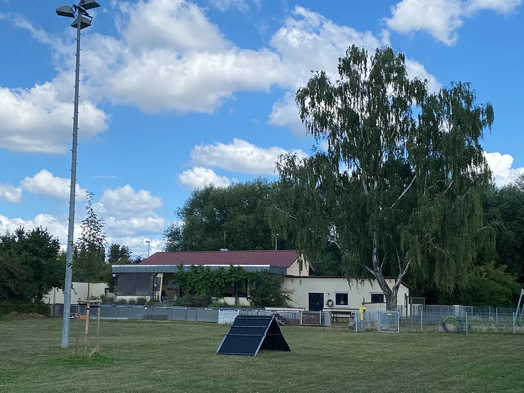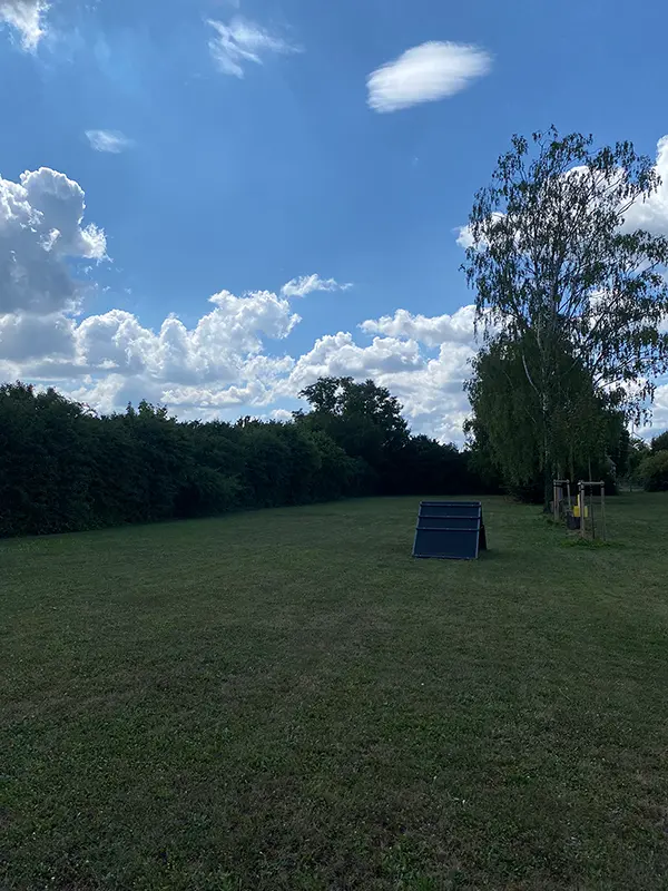 Unser weitläufiges Trainingsgelände bietet optimale Bedingungen für Hund und Mensch. Der große Übungsplatz ist so angelegt, dass bis zu vier Trainingsgruppen gleichzeitig arbeiten können – ohne sich gegenseitig zu stören. Dank des alten Baumbestands gibt es auf dem Platz ausreichend Schatten, was das Training auch an warmen Tagen angenehm macht.