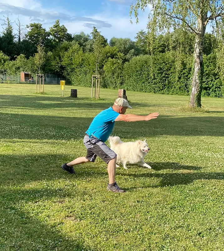 nach bestandener Begleithundeprüfung: Basistraining mit Schwerpunkt Freifolge und weiterführende Lektionen wie Steh, Voraus, Apportieren, Weitsprung, Kletterwand, Revieren, Gewandtheitsübungen